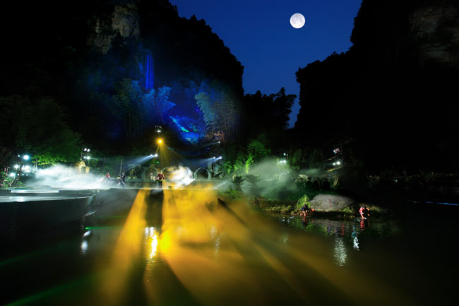 The Ancient Mystical Legend of Zhangjiajie 《武陵魂•梯瑪神歌》是一場(chǎng)記述土家族起源、演變、戰(zhàn)爭(zhēng)、生產(chǎn)生活等內(nèi)容的大型立體山水實(shí)景演出,揉合了音樂(lè)、舞蹈、文學(xué)等多種藝術(shù)形式,如幻如夢(mèng)的舞美燈光,搖曳生姿的原生態(tài)歌舞……濃縮了土家族數(shù)千年的發(fā)展歷史,400多名演員以自然淳樸的表演充分的展示了土家的民族文化特征,給游客帶來(lái)了耳目一新的感受。一場(chǎng)視聽(tīng)的饕餮盛宴,一曲驚天地、泣鬼神的曠世古歌,給人山水文化光影視聽(tīng)的享受!境銎罚簭埣医缣莠斏窀栉幕瘋鞑ビ邢薰尽