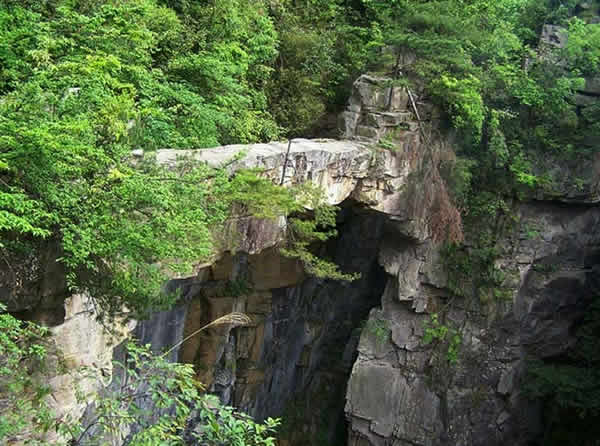 仙人橋又稱天下第一橋,坐落在猴子坡上、天子峰下的王爺洞對面。橋?qū)僮匀恍纬,長26米,寬1.5米,厚一米多,高約六七十 米,飛架在兩岸懸崖絕壁之上,鬼斧神工,惟妙惟肖,古人云:“天地可掬,此真天造也”。仙人橋為紅砂巖結構,兩端生有高大的黃山松和杜鵑樹,濃蔭掩映,極其美麗。橋的東頭還有自然形成的石級,人可順石級而下,走上天橋,下視萬丈深淵,令人頭暈目眩,非健壯者不敢逾越,旅游者無不贊嘆,說它是“天下絕景”。
