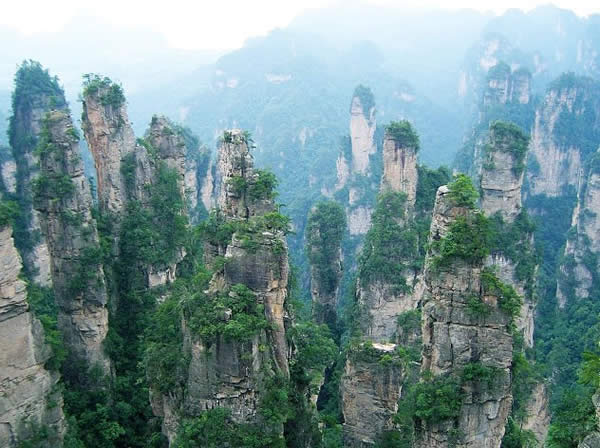 從仙人橋去老屋場,但見深谷里密密麻麻羅列上百座石峰,活像一群威武雄壯的將士列隊聽令,相傳這是向王天子的神兵在聚會。神話雖不可靠,但石峰如此集中壯觀,在武陵源也屬罕見。我想引用一位美術大師的話:“豈有此理,莫名其妙,說也不信,到此方知”。不看神兵聚會,怎知石峰成林。