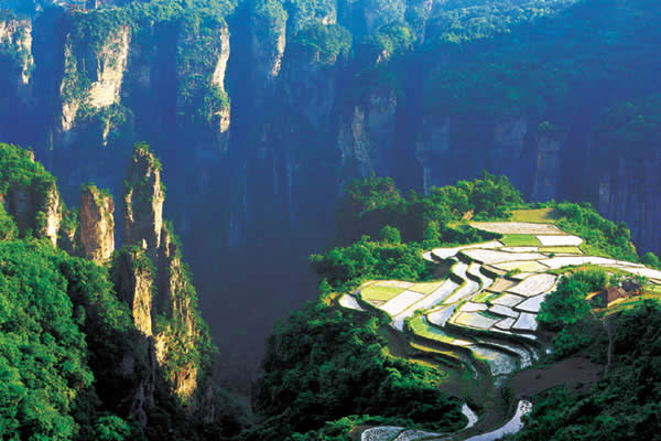 空中田園坐落在天子山莊右側經(jīng)老虎口、情人路方向兩公里處的土家寨旁,海拔1000余米。它的下面是萬丈深淵的幽 谷,幽谷上有高達數(shù)百米的懸崖峭壁,峭壁上端是一塊有3公頃大的斜坡梯形良田。田園三方峰巒疊翠,林木參天,白云繚繞,活像一幅氣勢磅礴的山水畫。登上“空中田園”。清風拂袖,云霧裹身,如臨仙境,使人有青峰鳴翠鳥,高山響流泉,身在田園里,如上彩云間”之感。