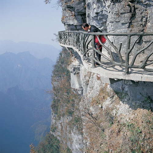 據(jù)施工人員介紹,此條棧道也是他們所修棧道中施工最難,最險峻的一條。如果您還覺得不夠刺激的話,在棧道的完結(jié)處的兩個懸崖之間有一條長160米的懸索吊橋,同時,在海拔最高點(diǎn)還有一個挑戰(zhàn)心里極限的玻璃站臺,在這里,如果你能挺直腰板伸開雙臂,那么,您就是真正的勇士了。