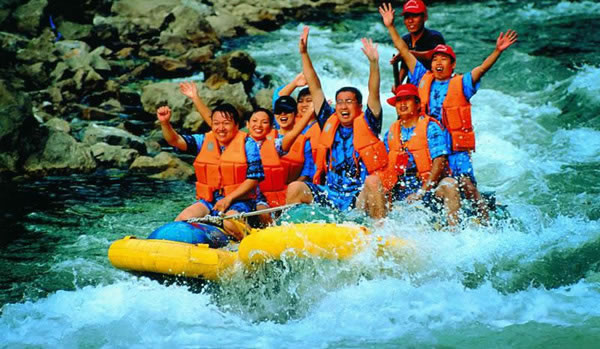 將離開王村之際,導(dǎo)游說猛洞河就在王村附近,不如去漂流一番。這個(gè)提議得到了大家的熱烈擁護(hù):早就聽說過猛洞河“天下第一漂”的美名,怎么可以迎面錯(cuò)過?于是揮師猛洞河,不過因?yàn)槭桥R時(shí)決定,時(shí)間上比較緊張,我們必須在兩個(gè)小時(shí)內(nèi)完成漂流——據(jù)說這是項(xiàng)不可能完成的任務(wù)。