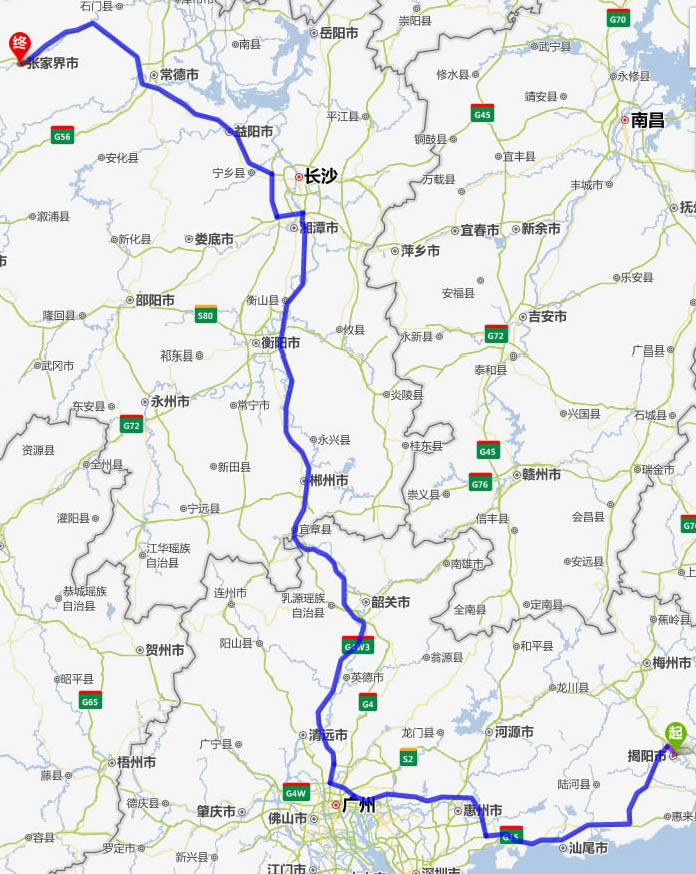 現(xiàn)在位置:張家界旅行社->交通指南->自駕車(chē)路線 -> 揭陽(yáng)到張家界旅游自駕車(chē)線路,揭陽(yáng)去張家界自己開(kāi)車(chē)要多長(zhǎng)時(shí)間,有多少公里